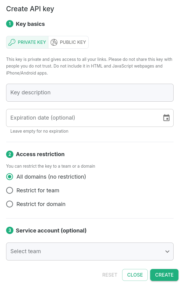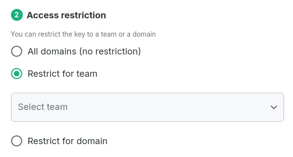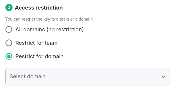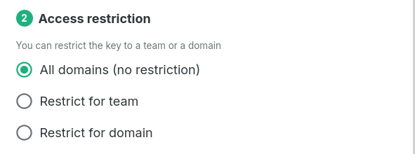 - select the API key access level - All domains (no restriction), Restrict for team or Restrict for domain