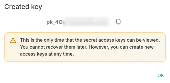 In the next dialog you can copy the newly created key and then use it in your requests: