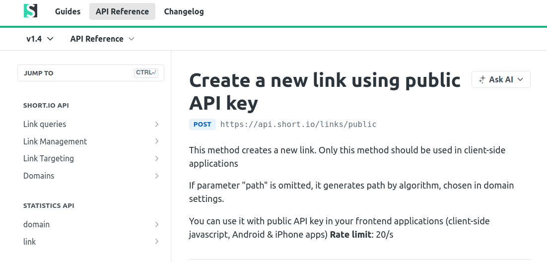 In the Short.io API reference section, you will find Link queries (e.g., Get link info, List links), Link Management (e.g., Create link, Update link, Delete link, Generate QR codes), Link Targeting (e.g., Get/Create link country & region targeting), and Domains (e.g., List domains, Get domain details, Update domain settings). The Statistics API includes domain-level and link-level metrics, such as Domain statistics, Link clicks, and Most popular links endpoints. Commonly used methods include creating a new short link, retrieving link details by ID, listing links for a domain, and fetching link click statistics.