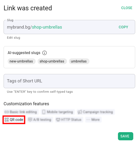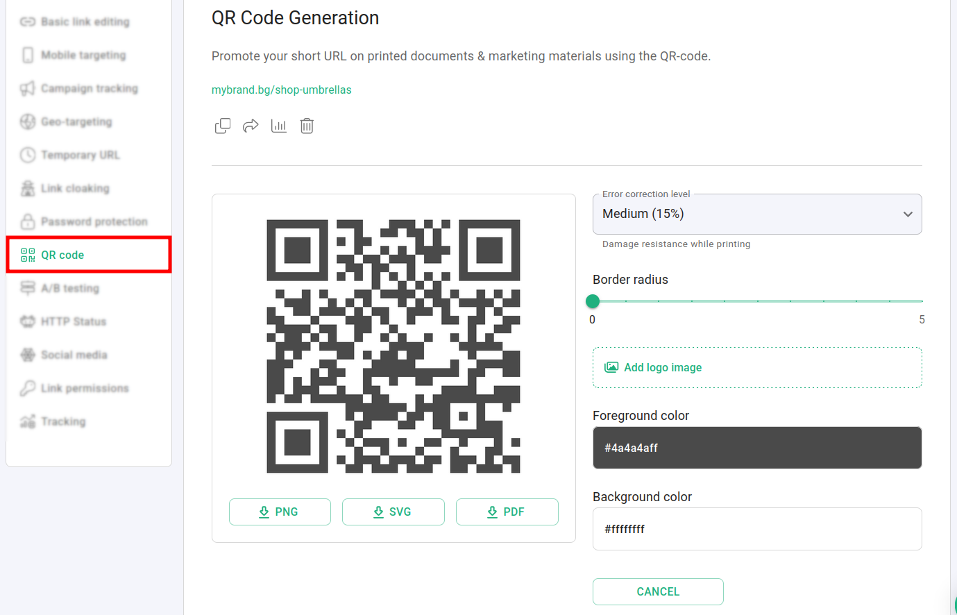 You can create QR codes for every shortened link and then download them in three different formats: PNG, SVG and PDF.