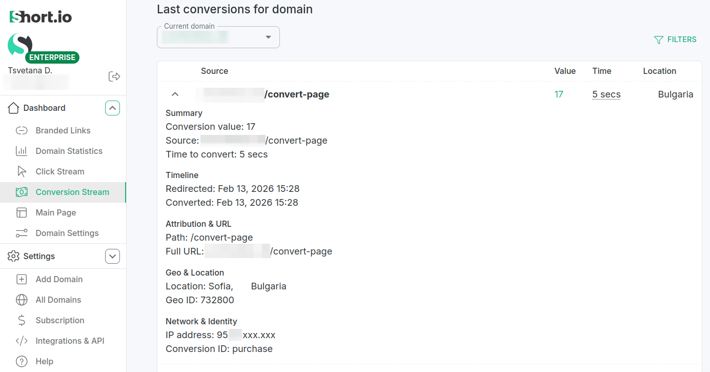 You can then review the conversion results for each link in the Branded links section of the Dashboard or for the entire domain in the Conversion Stream section.