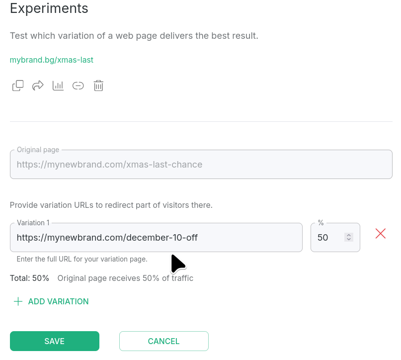 Hereafter, when a short link is clicked, the given percentage of users will be directed to the original page, while the remaining percentage will be sent to the variation page(s).