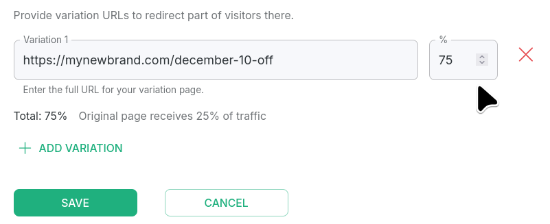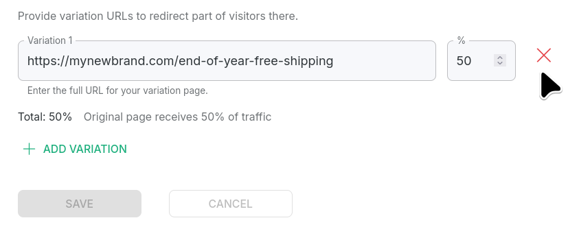 The original URL is set by default in the A/B testing section. You can specify a variation page by clicking + Add variation and entering the long URL of the page you want to test with: