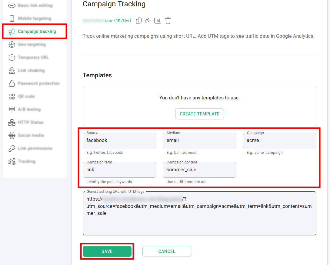 You have the option to review the generated long link including the UTM tags. Click on Save to confirm.