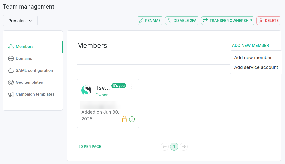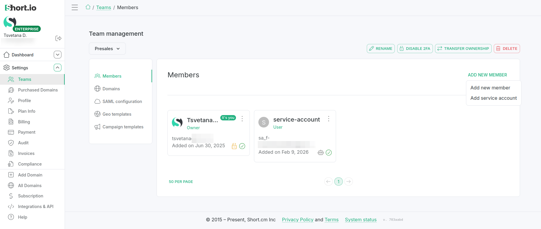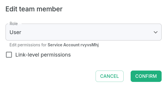 Service accounts are designed to avoid issues that can arise when team members change. If an API key is created under a personal user account, it may become unavailable when that person leaves the company. To address similar situations, Short.io introduces a special type of user which team owners can create, assign to particular teams and designate with one of three roles: Admin, User, or Read-only.