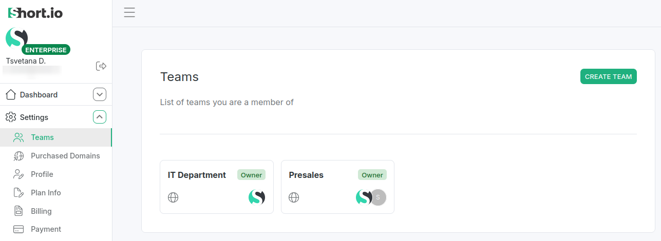 From the Dashboard's left panel select Settings->Teams.