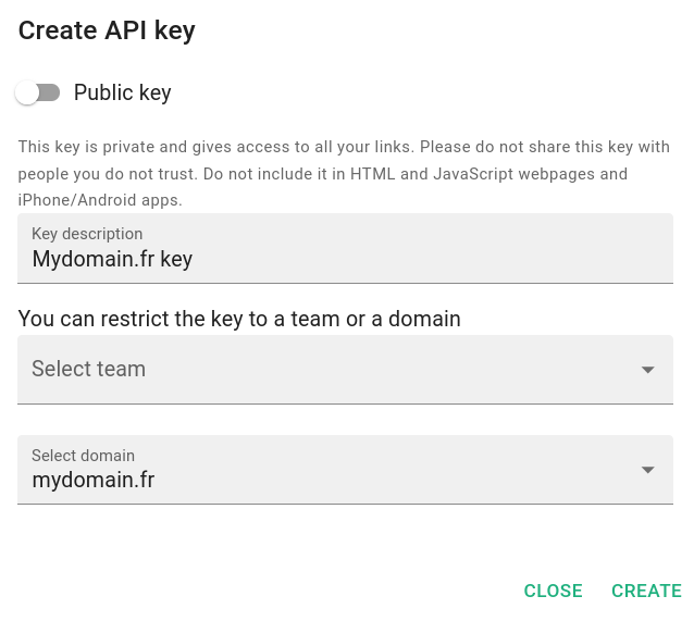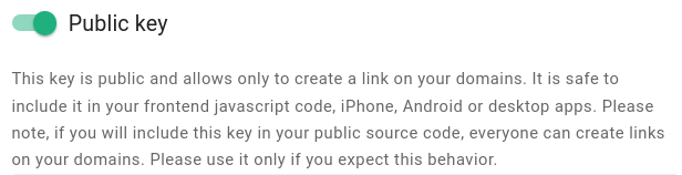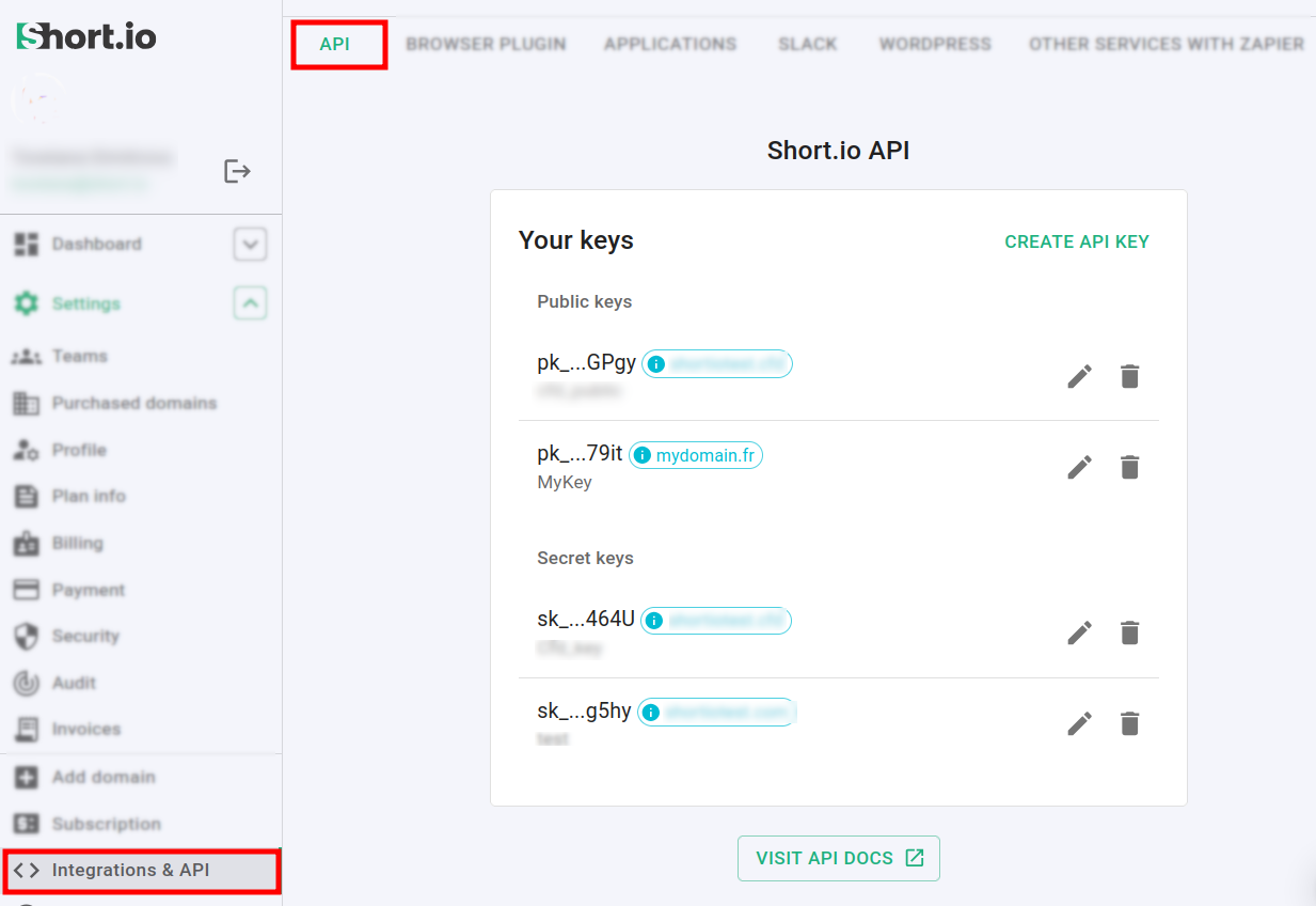 The Short.io API features can only be accessed with an API key that you create for specific domain/team. Furthermore, API keys allow you to determine the purpose for which the API is used and therefore prevent fraud.