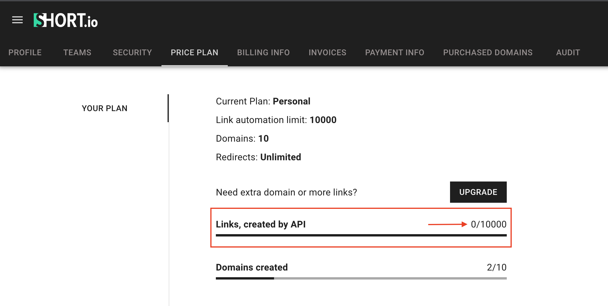 On the Links, created by API counter you should see 0 used out of your plan limit: