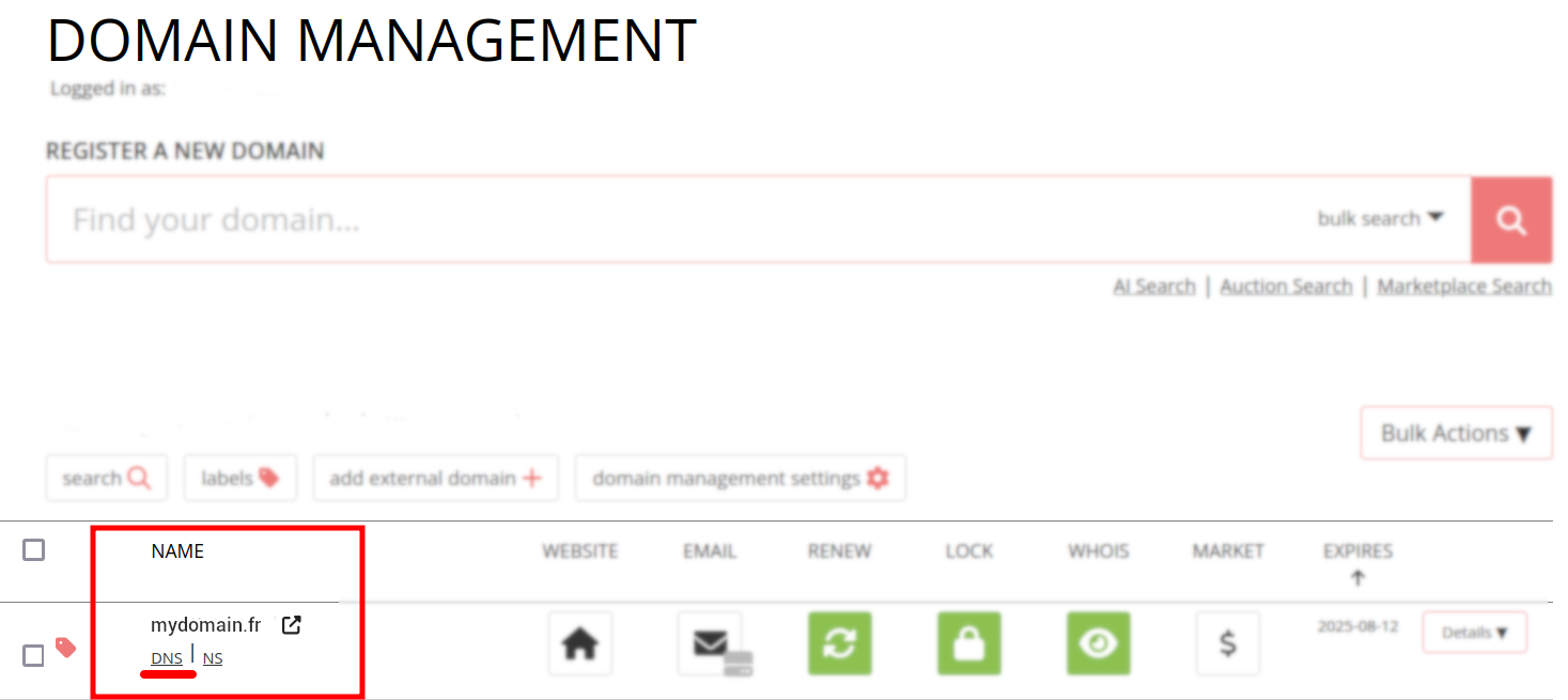 Mouse over the domain which you want to connect with Short.io and click on the DNS option that appears.