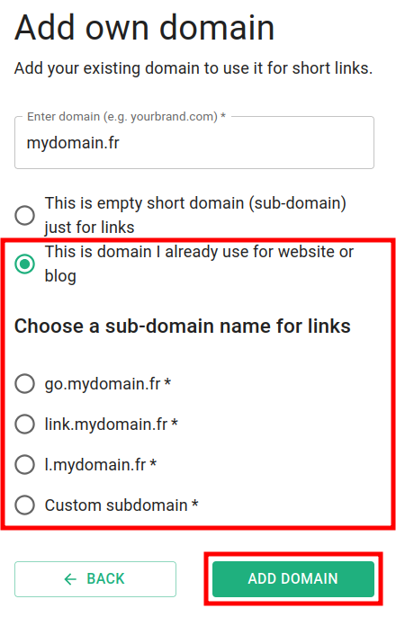 Select the option that suits you best for subdomain name and click on Add domain.