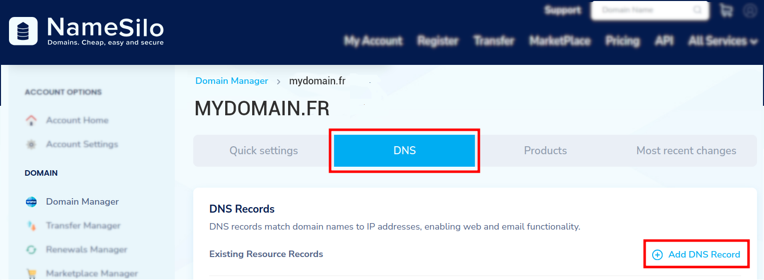 When your main domain is active in NameSilo, add a subdomain.