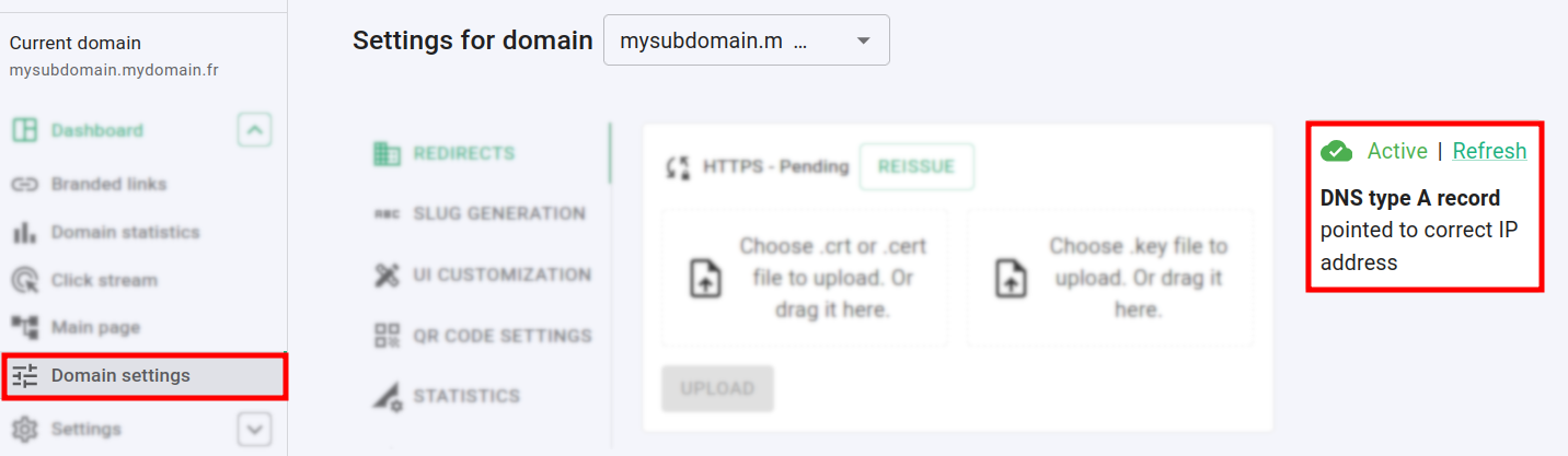 The subdomain is created and you can review its status by clicking on Domain settings: