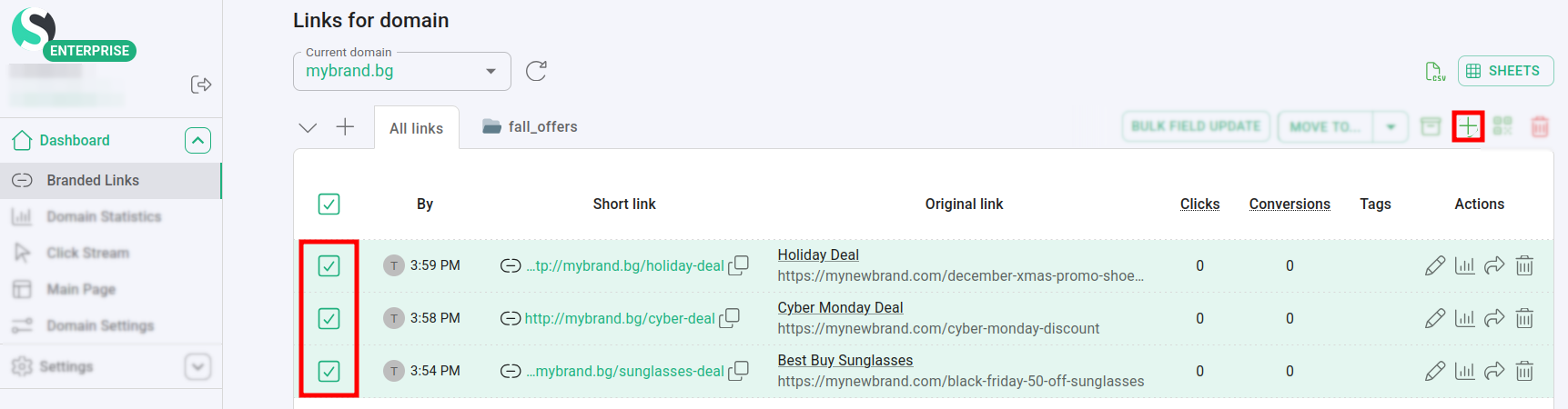 Navigate to the Branded links and select the links to which you want to add a tag: