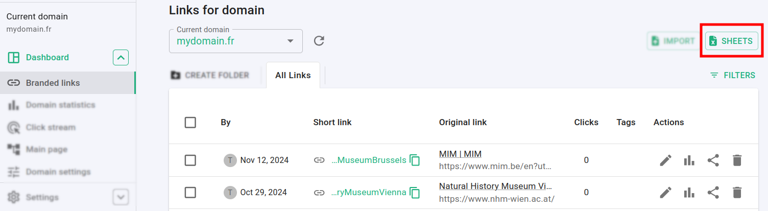 In the Dashboard navigate to the Branded links panel and click on Sheets: