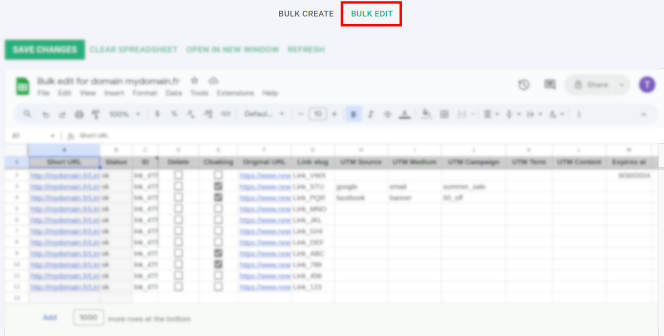 You can edit short links in bulk by changing the following options: cloaking, original URL, slugs, UTM tags, click limits, expiration date/link, TTL, tags, link title, iOS/Android links, and creation date.