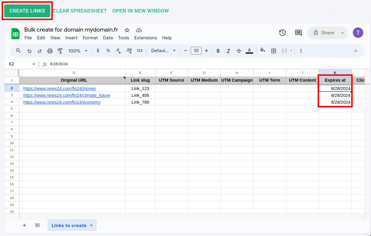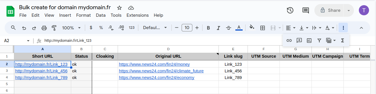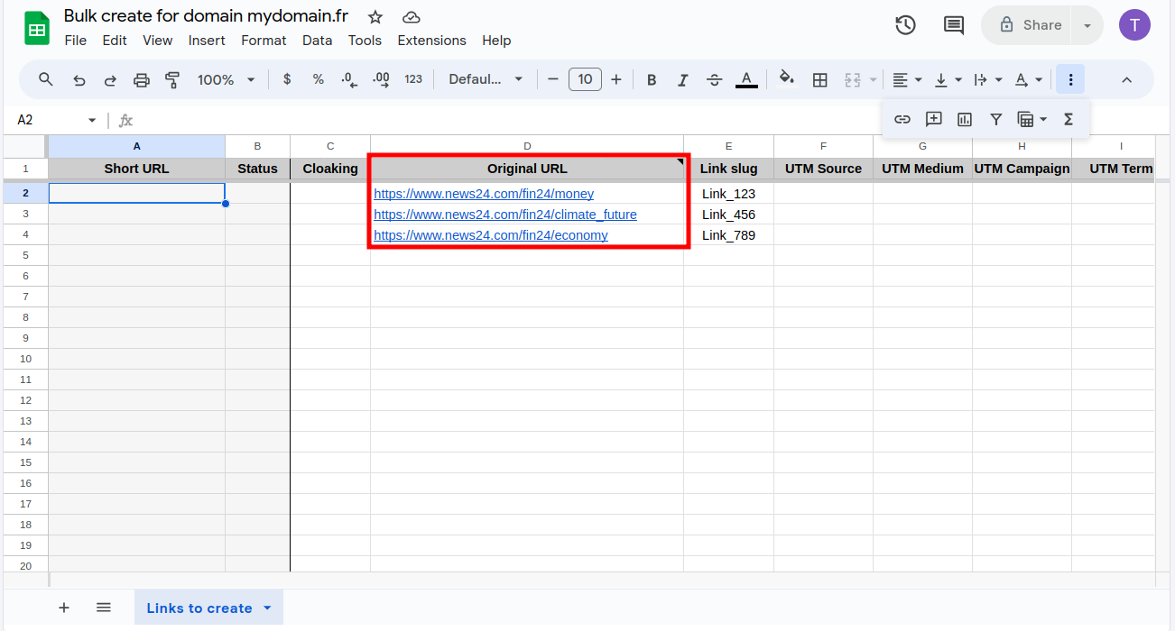 In the Google Sheet screen manually paste the links to be shortened in the required Original URL cells. You can also fill in other optional columns, for example: Link slug