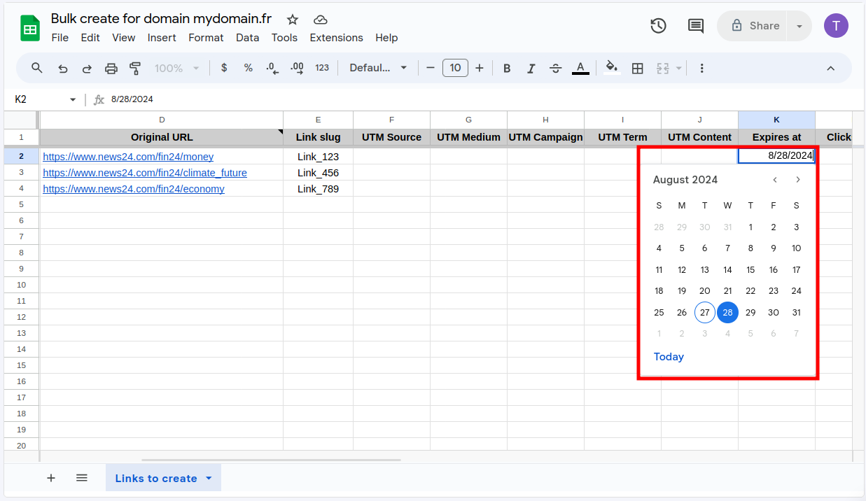 Select an expiration date and copy it to all the rows that contain links to shorten: