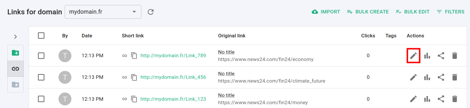 In the Dashboard navigate to the Branded links panel and click on Bulk create: