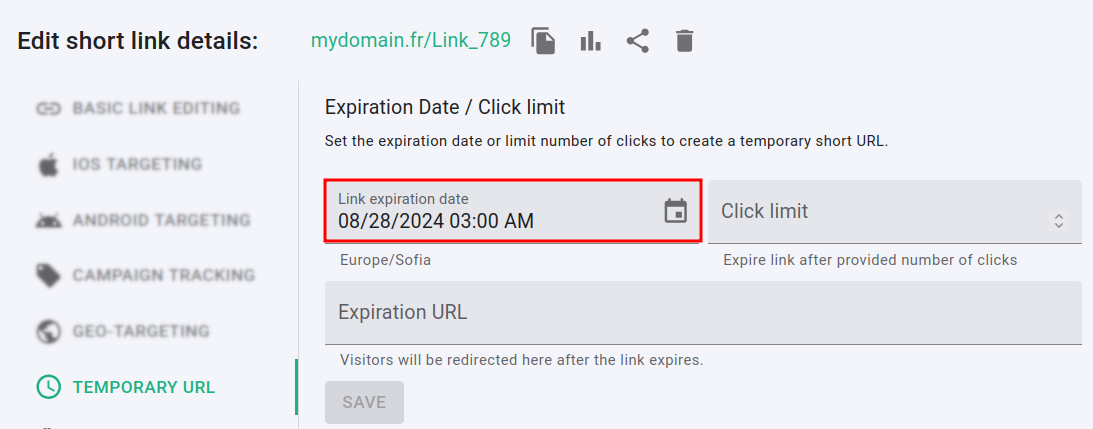 The Bulk link expiration functionality allows you to specify an expiration date that will be automatically applied to a group of links when they are shortened.