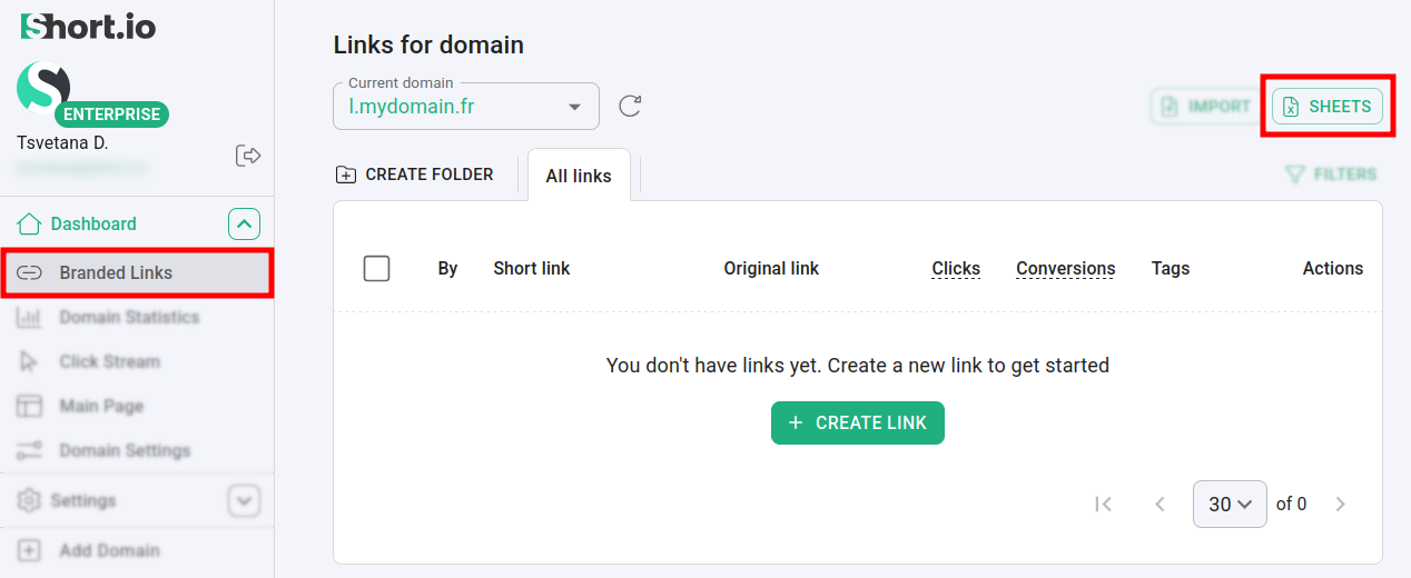 In the Dashboard navigate to the Branded links panel and click on Sheets: