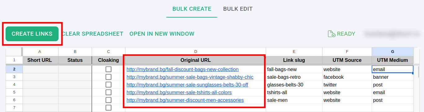 Manually paste the links to be shortened in the required Original URL cells. You can also fill in other optional columns, for example: Link slug