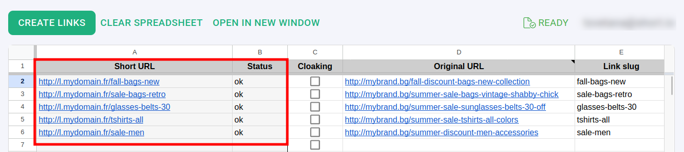 Note: The columns A (short URLs) and B (status of the operation) are populated automatically.
