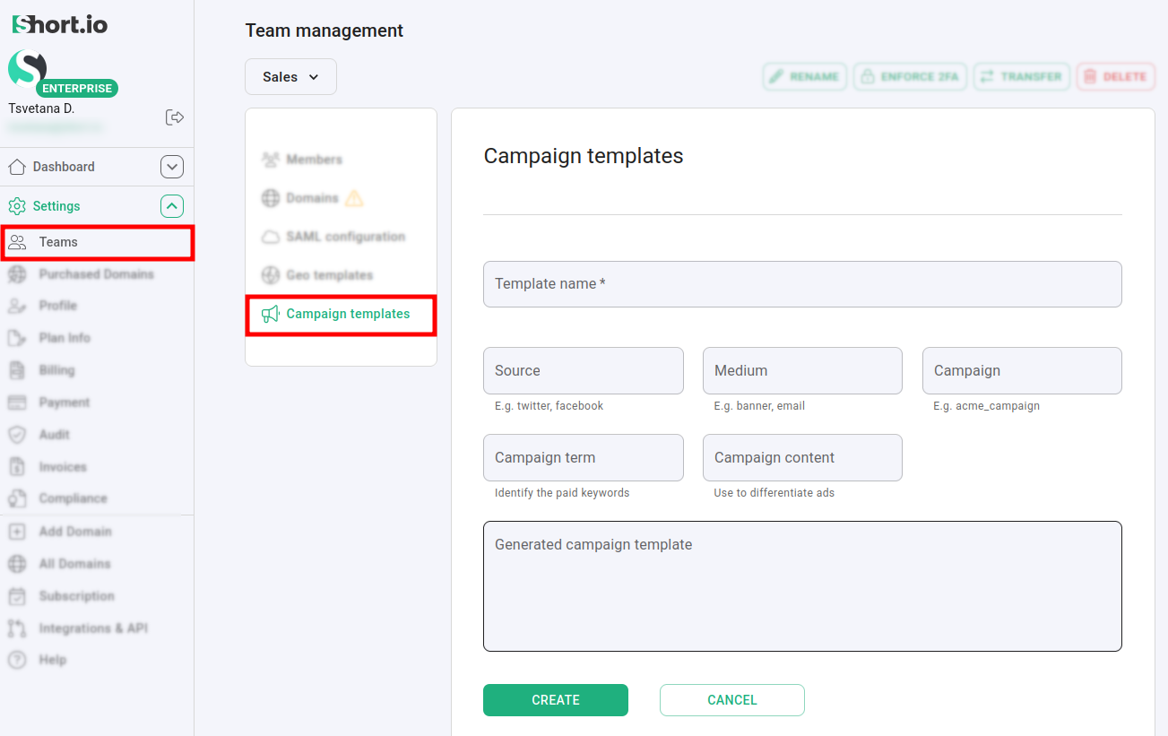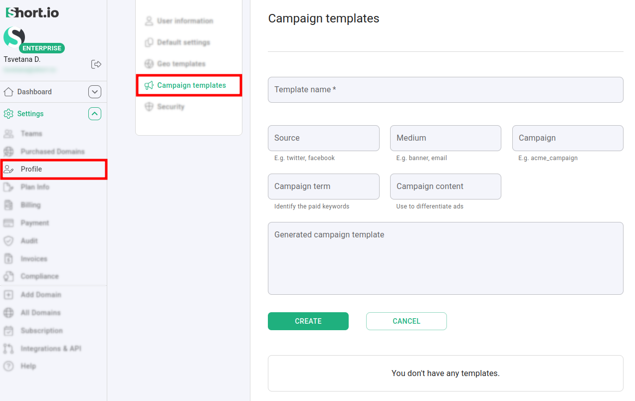 Short.io provides you with the possibility to create campaign (or UTM ) templates which can save you time and effort when adding UTM tags to short links.