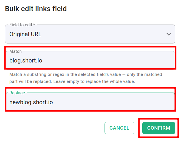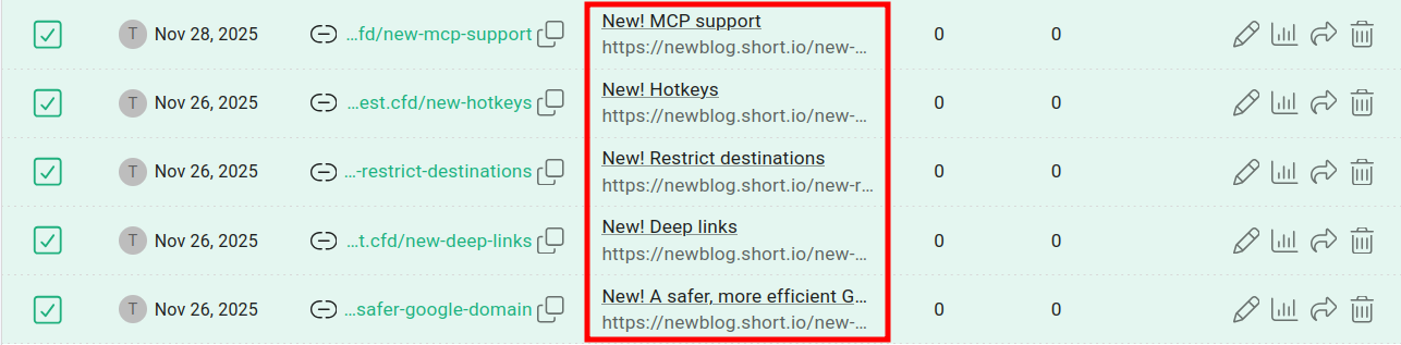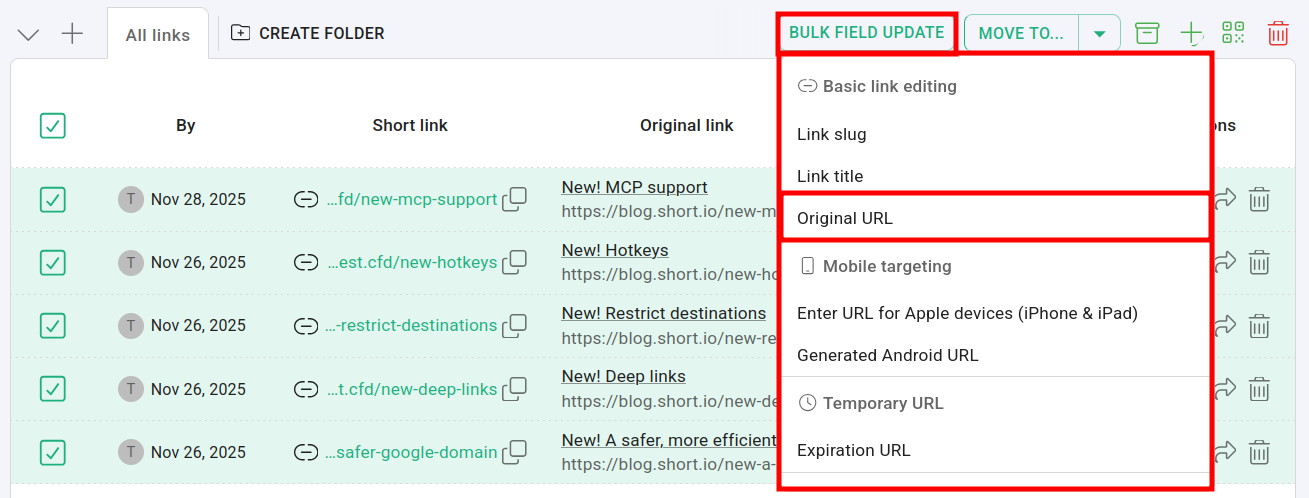 Short.io recently introduced a new feature that allows you to edit several short link fields simultaneously.