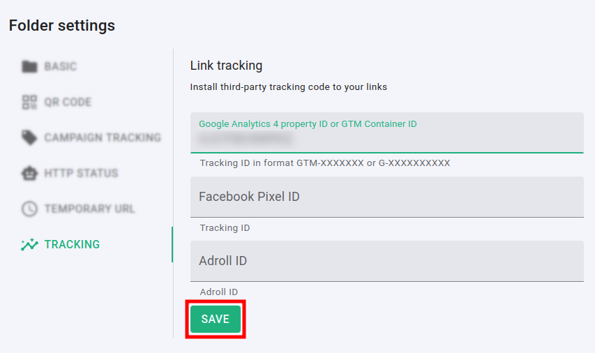You can choose between different third-party tracking codes to add to all links in a folder.