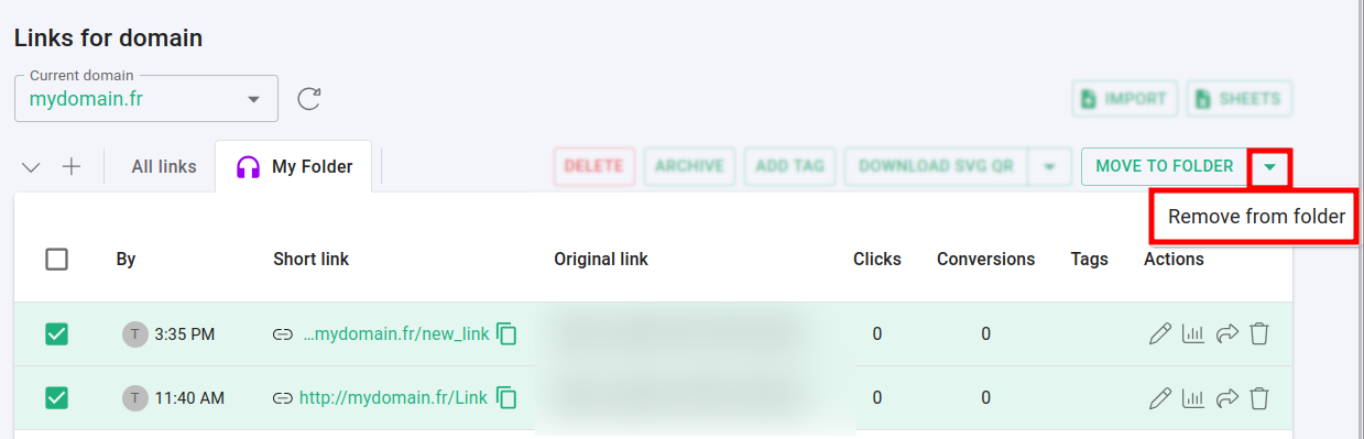 You can either remove one link from a folder using the edit menu or remove multiple links at once from the Branded links panel.