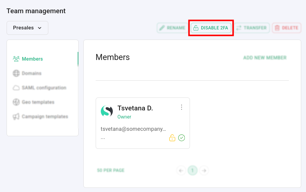 To disable 2FA for a team