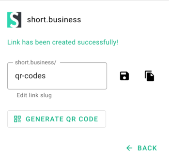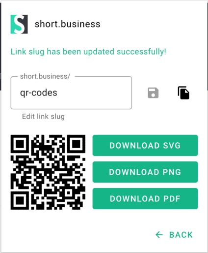 After the link is shortened you can generate a QR-code for it. After that download the QR-code in three different formats: svg, png, pdf.