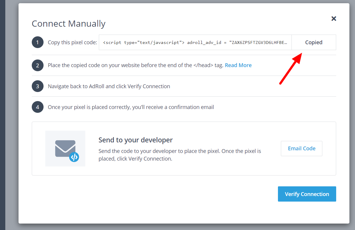 3. Copy the code and extract adroll-adv-id & adroll-pix-id.