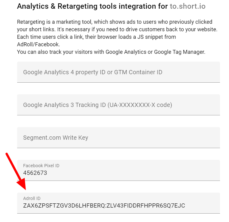 To connect AdRoll to Short.io, you don’t need to be a developer or know all about codes. The only thing you need to do is to input AdRoll Pixel IDs to Short.io settings.