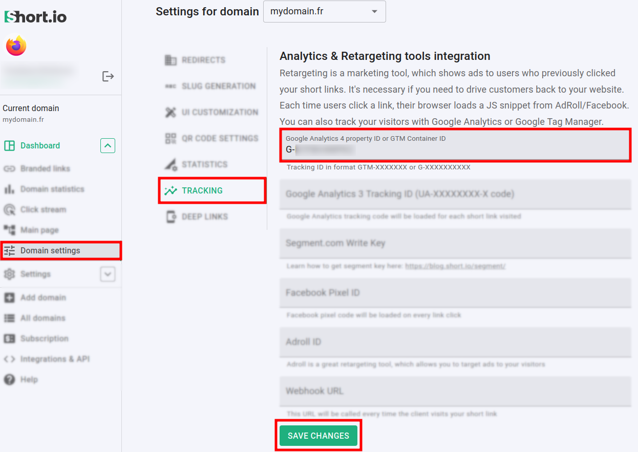 Short.io integrates with Google Analytics directly. You are not required to implement any third-party service or JavaScript code to the website. Just Input a tracking code to Short.io domain settings, and Google Analytics will get the traffic data**.**