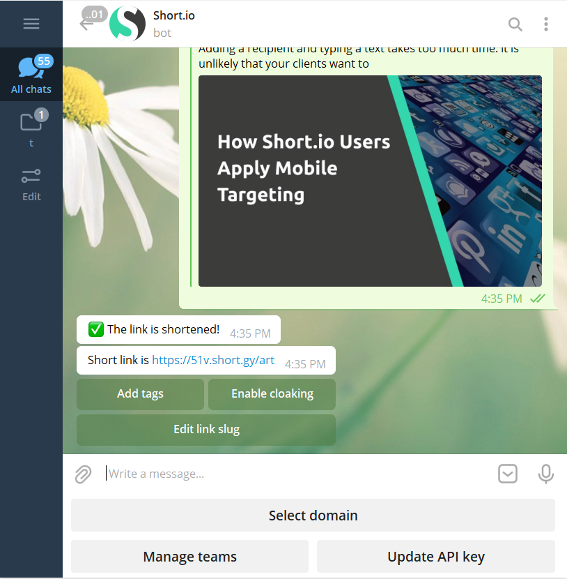 Short.io has launched Telegram bot to shorten links outside the dashboard.