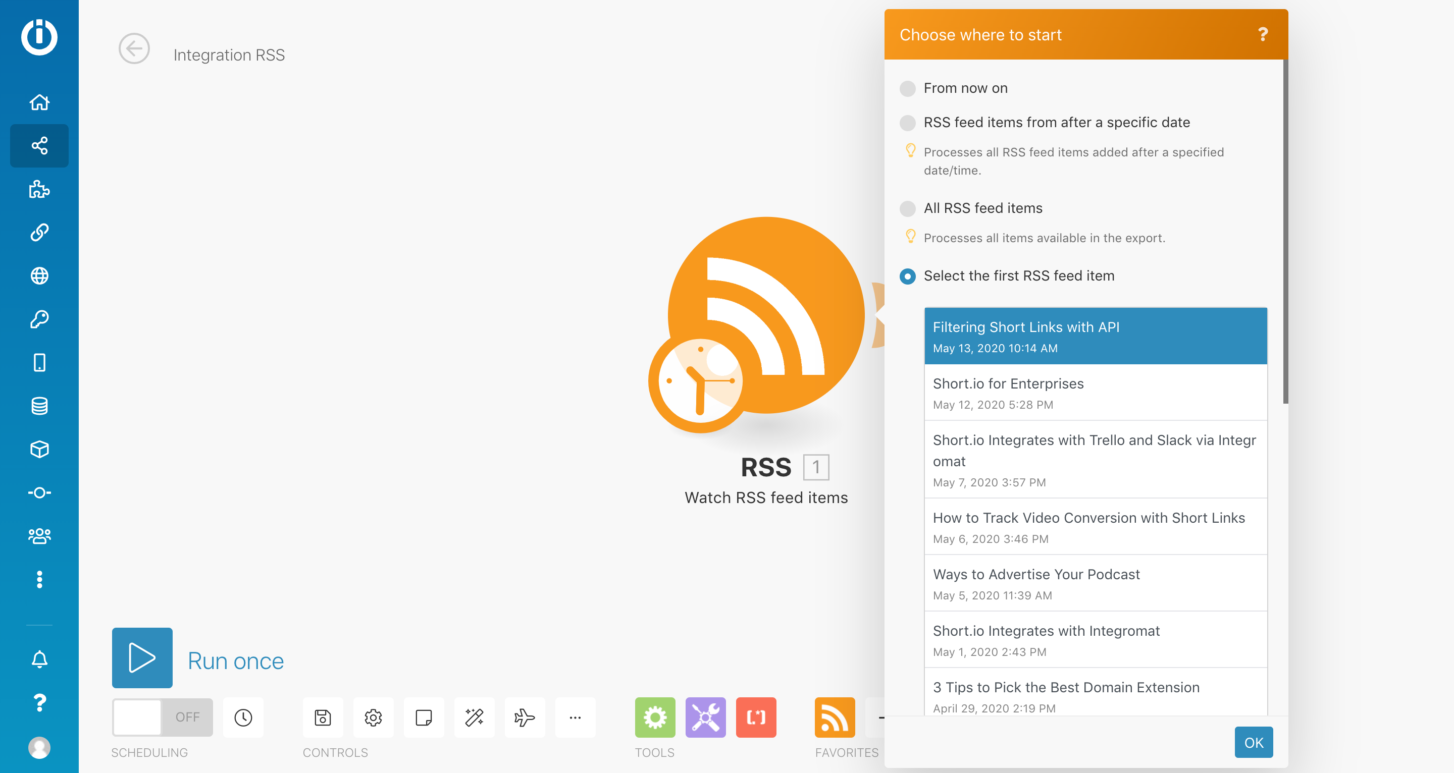 7. Choose where to start. As for example to test the integration, we choose select the first RSS item > Choose the item > OK.