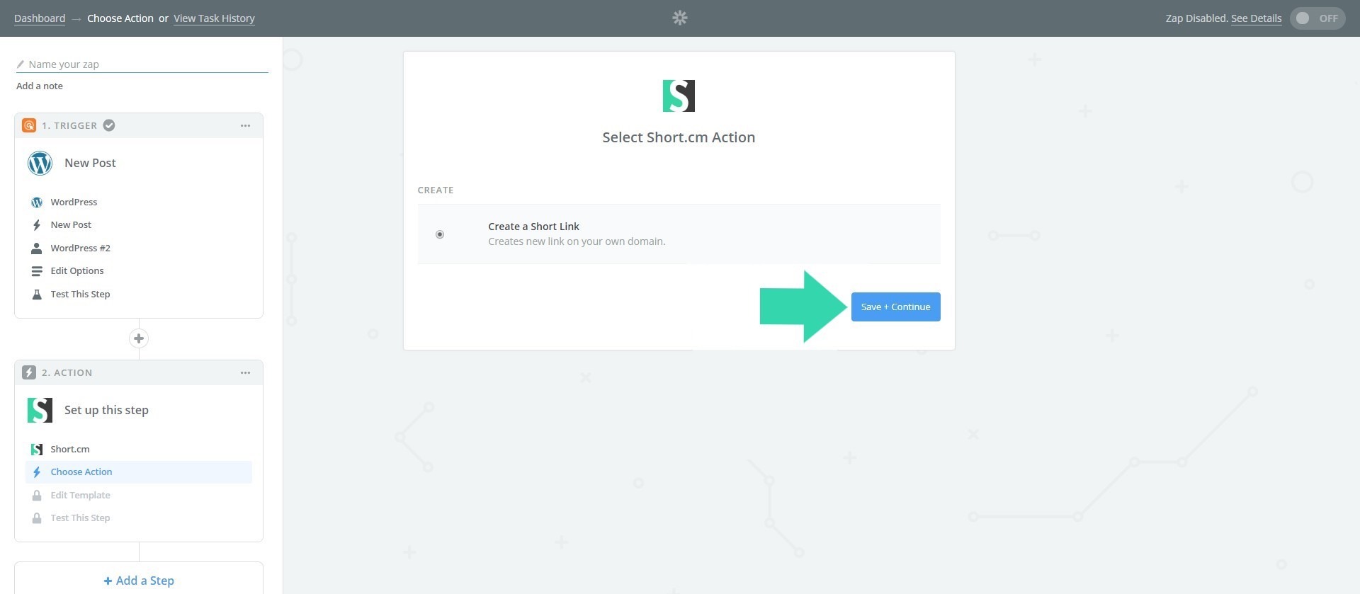 Straight to the video guide or follow the instruction to configure WordPress & Short.io Zap.