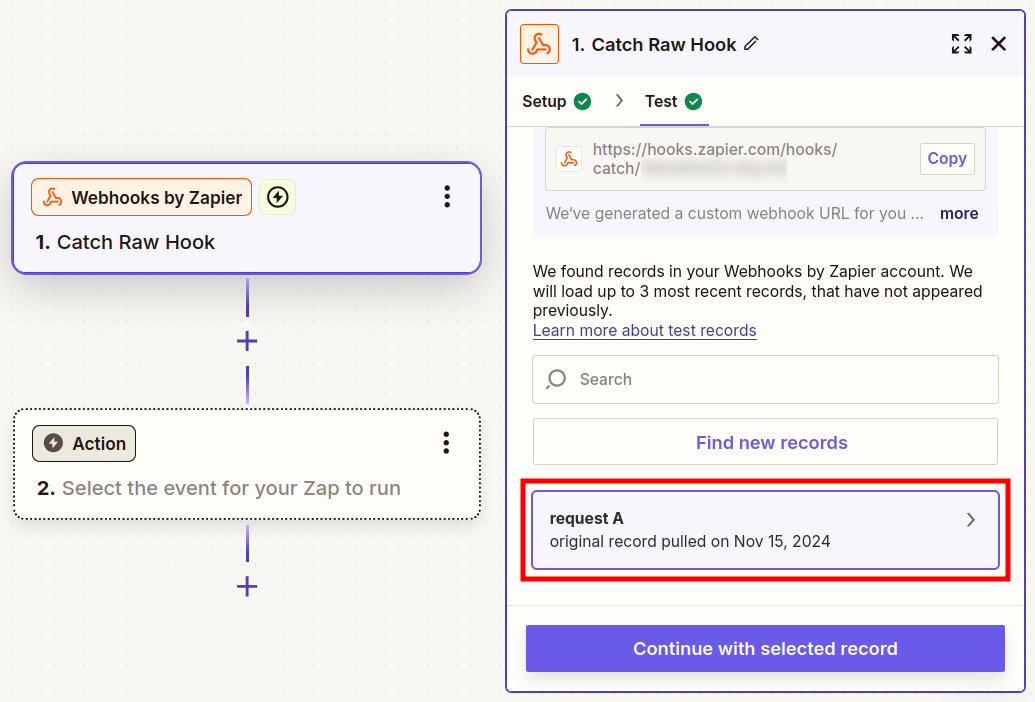 Zapier should display the record of your request, thereby confirming the successful completion of the test: