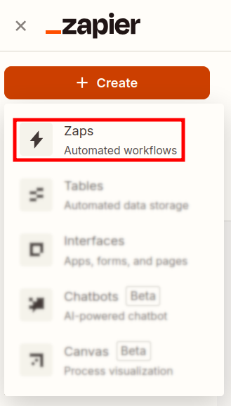From the left panel, create a new zap by clicking on + Create and then on Zaps: