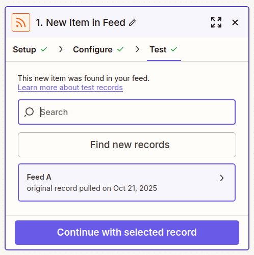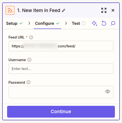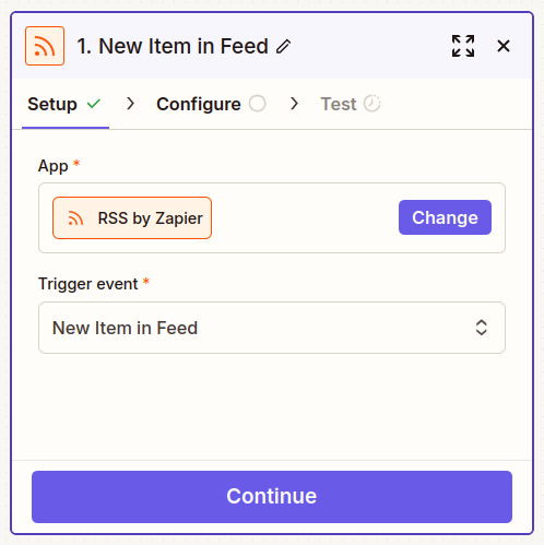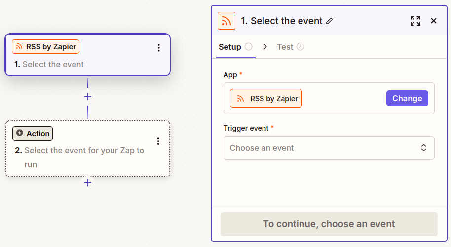 Next, select a trigger app and event (e.g., a new blog post or social media update):