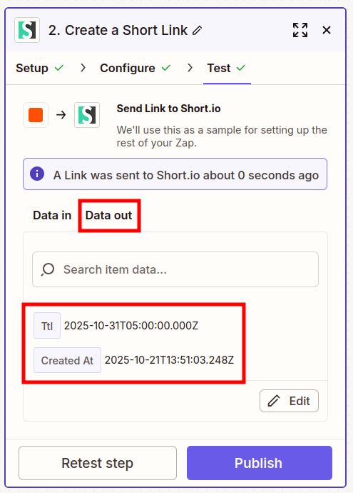 From Zapier, you can also review the TTL date and time in the Data out section: