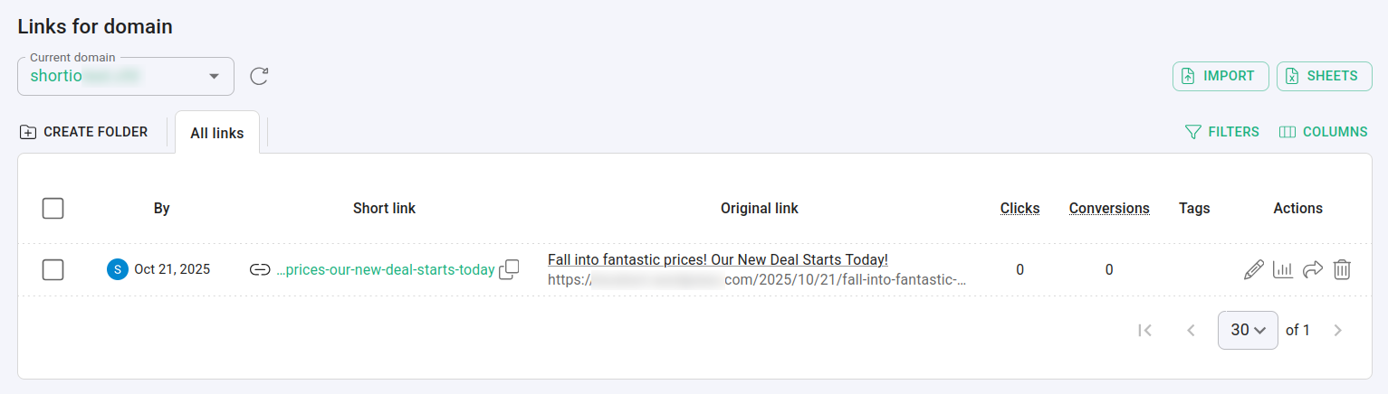Upon successful completion, the short link appears in your Short.io Dashboard: