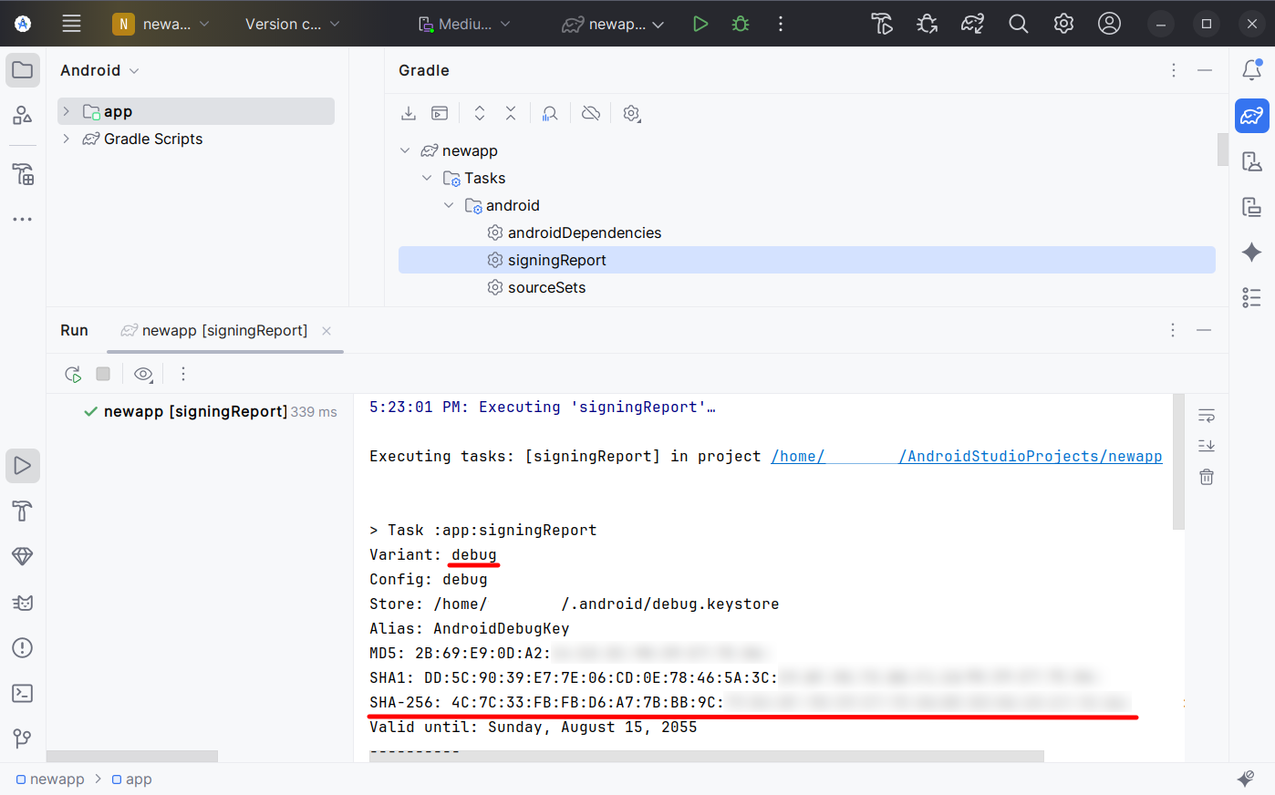 Then type gradle signingReport and select it from the list. Your signing results for Debug and Release versions will be generated: