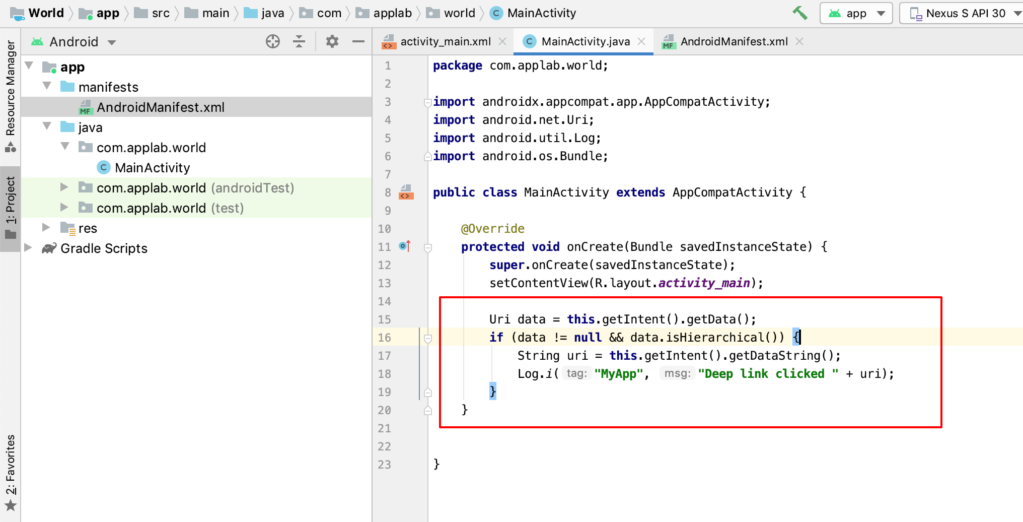 Run the Android Studio emulator and follow the link you have specified in the AndroidManifest: