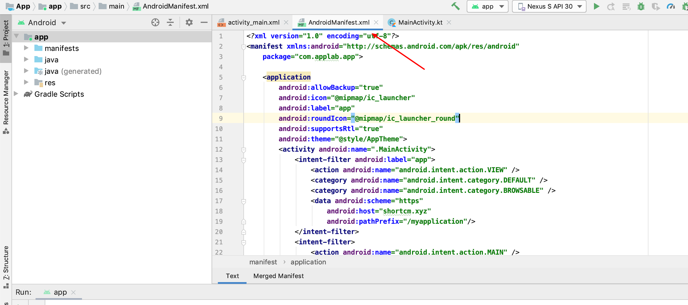 Open the AndroidManifest.xml file of your application: