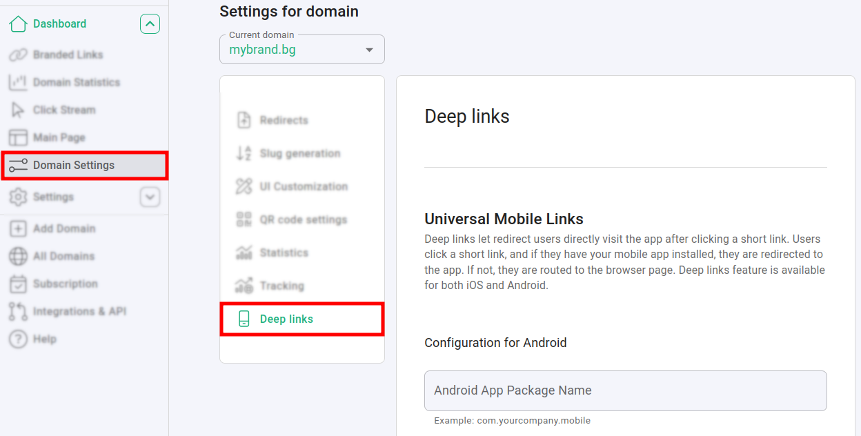 Navigate to Domain Settings > Deep links: