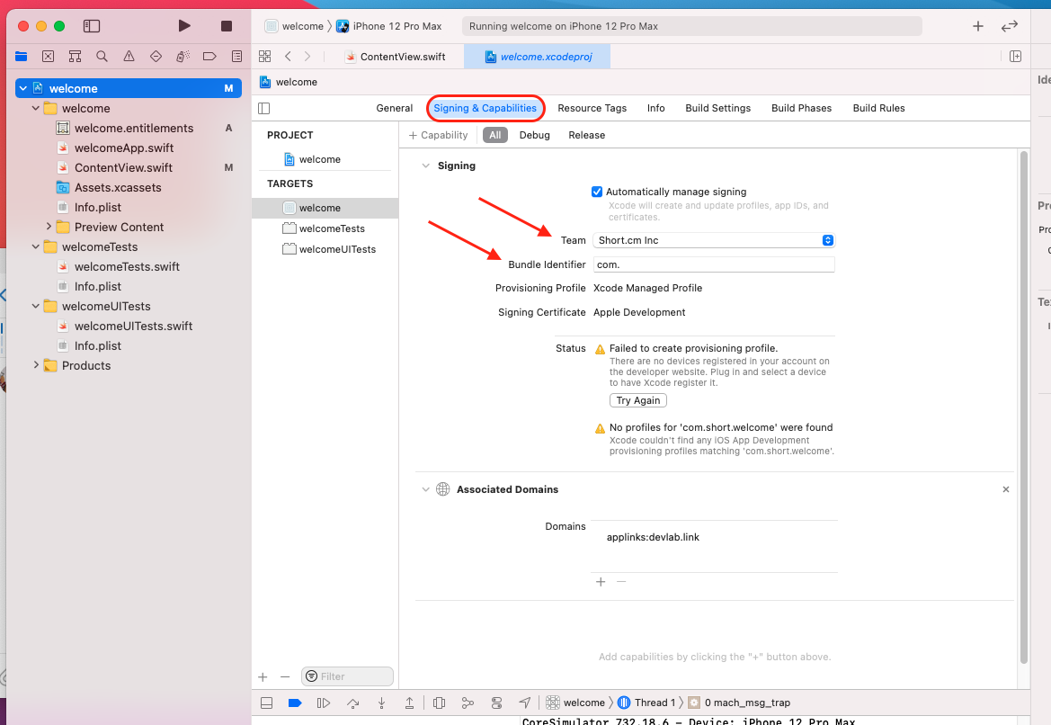 Open Domain Settings > Deep links for the short domain you have specified in Xcode: