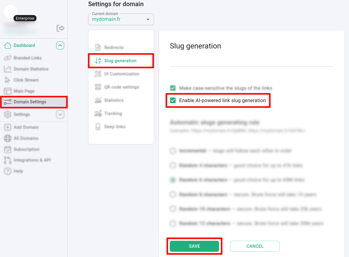 The AI powered slug generation feature is enabled by default for each newly added domain to Short.io. You can disable and/or re-enable it as follows: