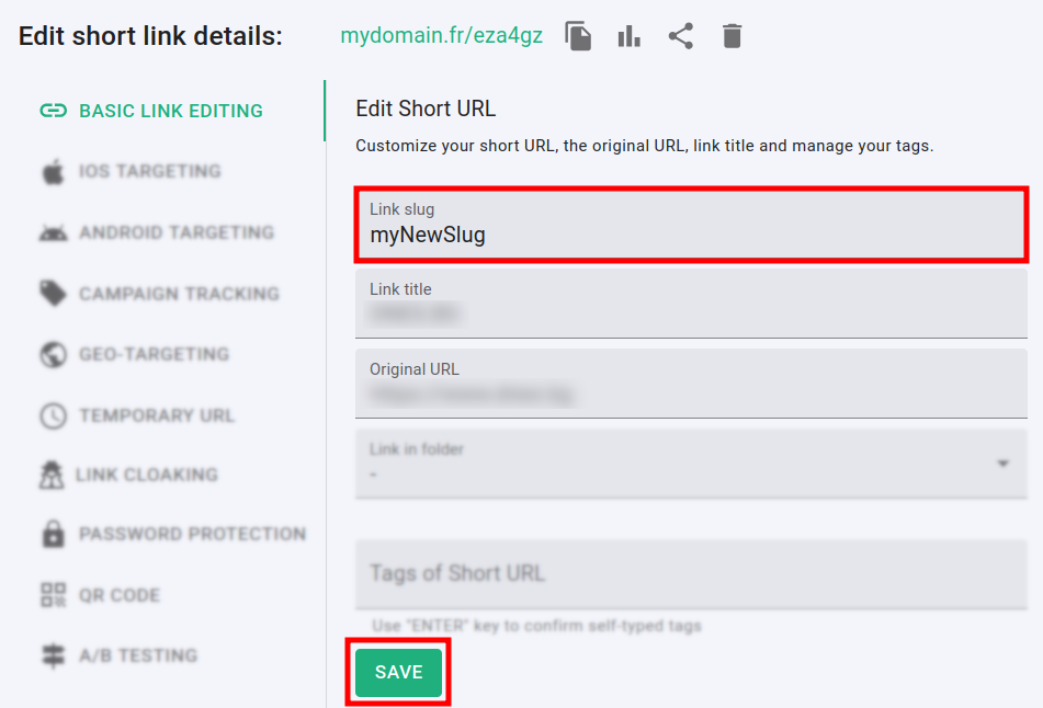 Note: The slugs are unique, and you cannot have two or more with the same name. However, Short.io supports case-sensitive slugs, for example, NewSlug and newslug can be regarded as distinct.